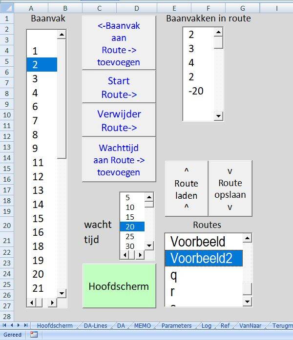 - Maak alle tabbladen aan: Hoofdscherm, DA-Lines, DA, MEMO, Parameters, Log, Ref, VanNaar, Terugmelders, Test, MeldersChecken, Routes en KiesRoute.